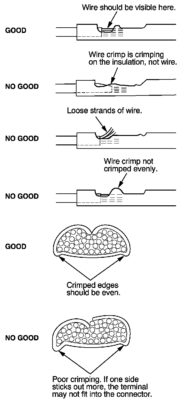 8. Inspect the quality of the wire crimp. If it has any of the following NO GOOD crimps, cut it off and start over.