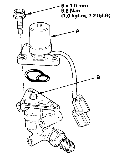 5. If the filter is not clogged, remove the VTEC solenoid valve (A), and push the VTEC valve (B) with your finger to check its movement. If the VTEC valve moves, check the engine oil pressure.