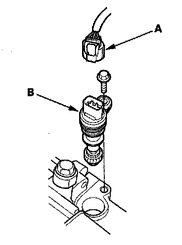 2. Disconnect the 3P connector (A) from the vehicle speed sensor (VSS) (B).