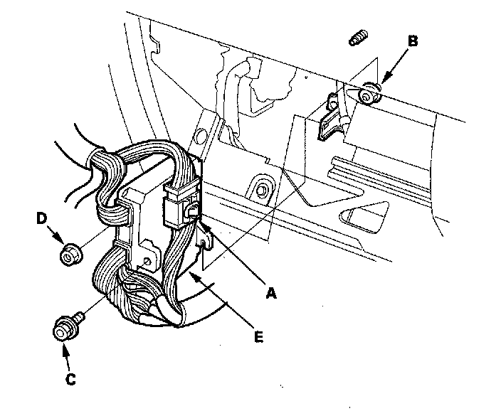 4. Lift the PCM up to clear the mounting nut on the lower right of the PCM, then pull out the PCM (E).