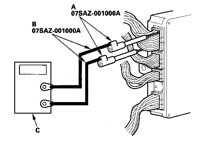 5. Connect the backprobe adapters (A) to the stacking patch cords (B), and connect the cords to a multimeter (C).
