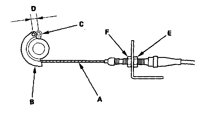 4. If the free play is not within specs, loosen the locknut (E), and turn the adjusting nut (F) until the free play is as specified, then retighten the locknut.