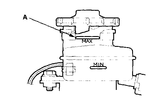 1. Make sure the brake fluid level in the reservoir is at the MAX (upper) level line (A).