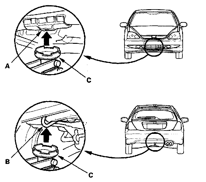 4. Position the floor jack under the front jacking bracket (A) or rear jacking bracket (B). Center the jacking bracket in the jack lift platform (C), and jack up the vehicle high enough to fit the safety stands under it.