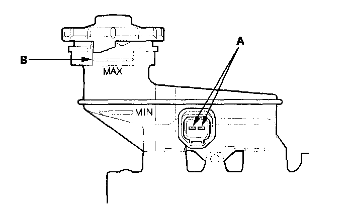 ^ Fill the reservoir with brake fluid to MAX (upper) level (B). With the float up, there should be no continuity.