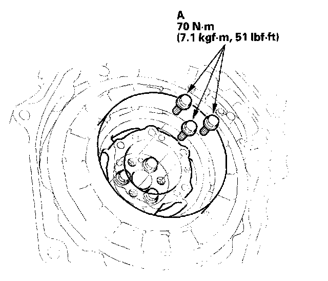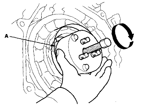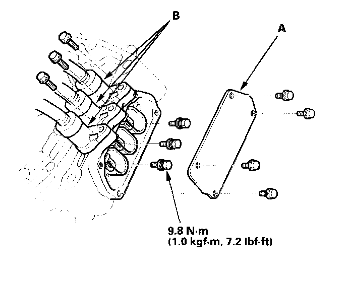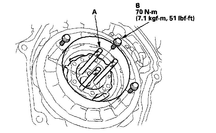 4. Install the guide pins (A), then remove the remaining three bolts (B).