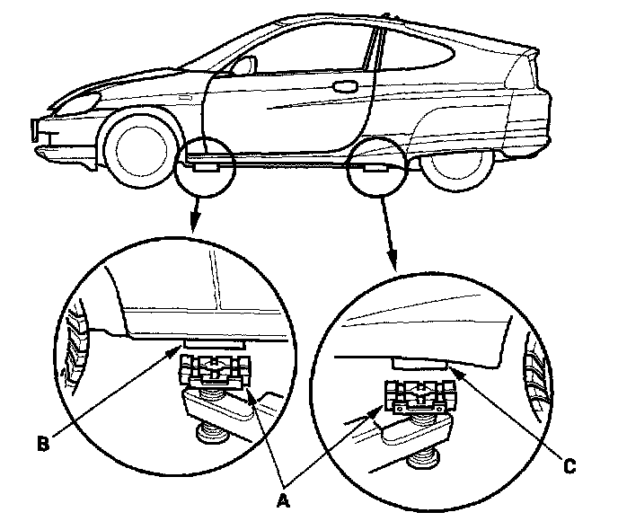 Position the hoist lift blocks (A), on safety stands, under the vehicle's front support points (B) and rear support points (C).