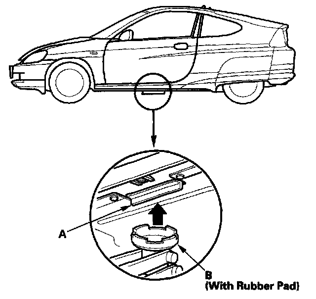 3. Position the floor jack under the left or right center support point (A), center the jack lift platform (B) on the jacking point, and jack up the vehicle high enough to fit the safety stands under it.