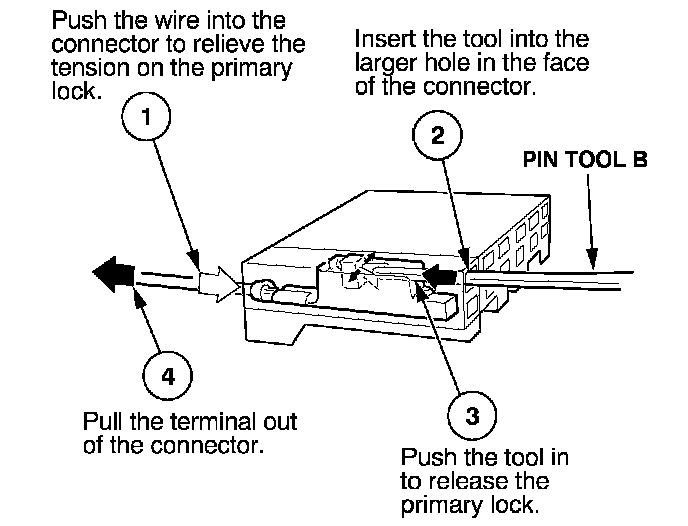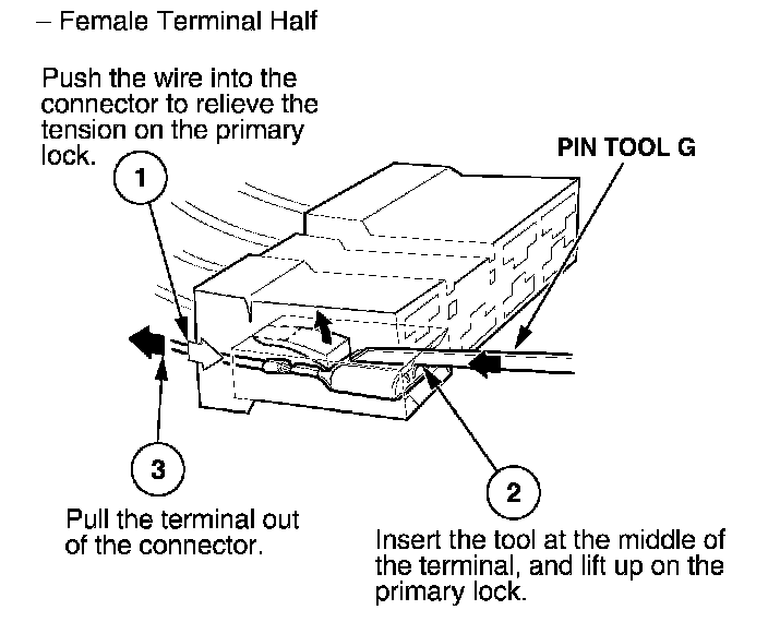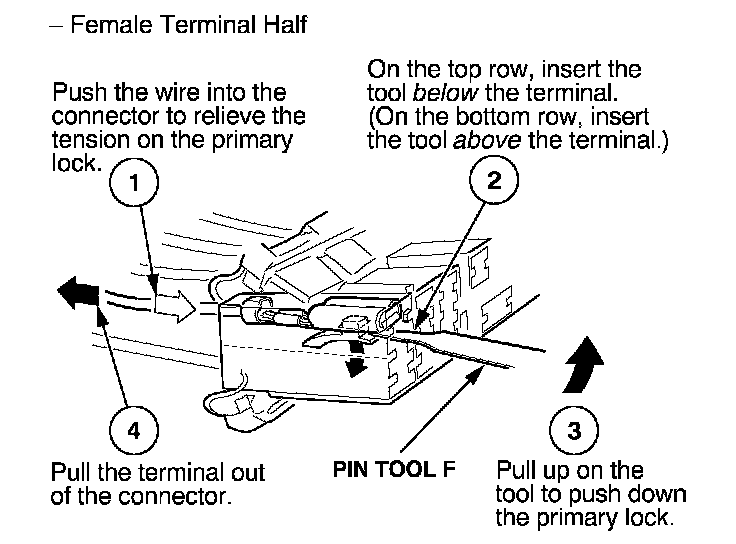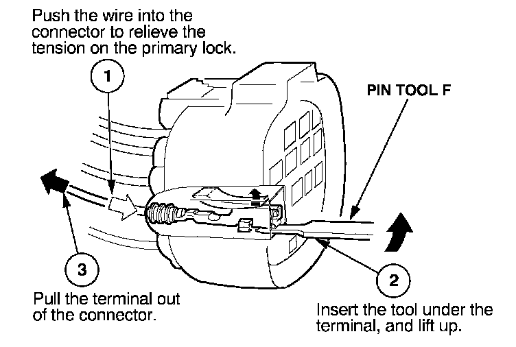 Before you begin, inspect the wire you are about to repair for damage and length. Make sure the wire will be long enough to make a terminal repair without stretching it when you reinstall the terminal in the connector. If the wire is too short, or if access to the connector is too restricted to make a terminal repair, you may need to install a pigtail terminal (a short length of wire with a factory-crimped terminal on it). Refer to HOW TO INSTALL PIGTAIL TERMINALS.