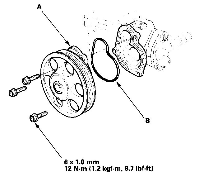 Install the water pump, with a new O-ring (B), in the reverse order of removal.