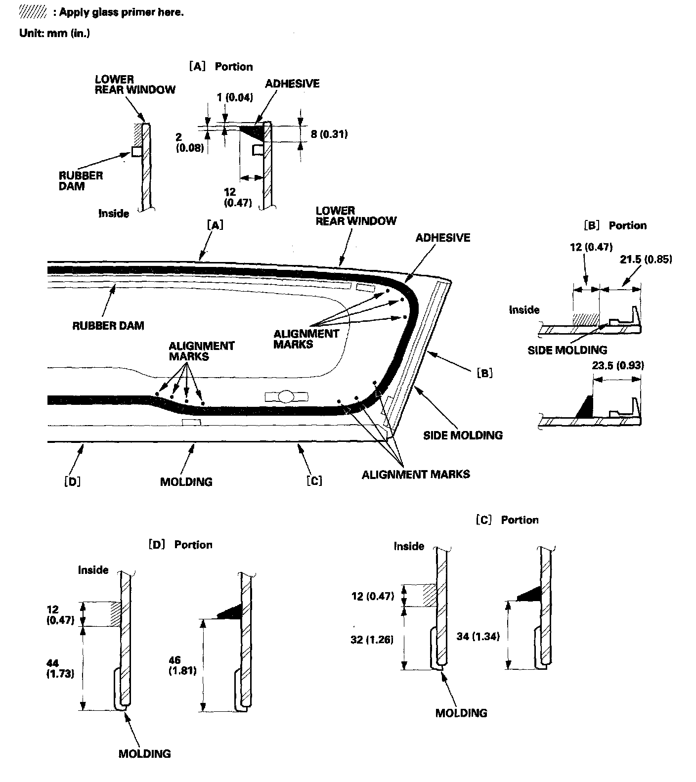 - To attach the molding, apply a light coat of primer to the areas between the alignment marks on the tower rear window, and attach the molding with urethane adhesive and adhesive tape and the side molding with adhesive tape.
