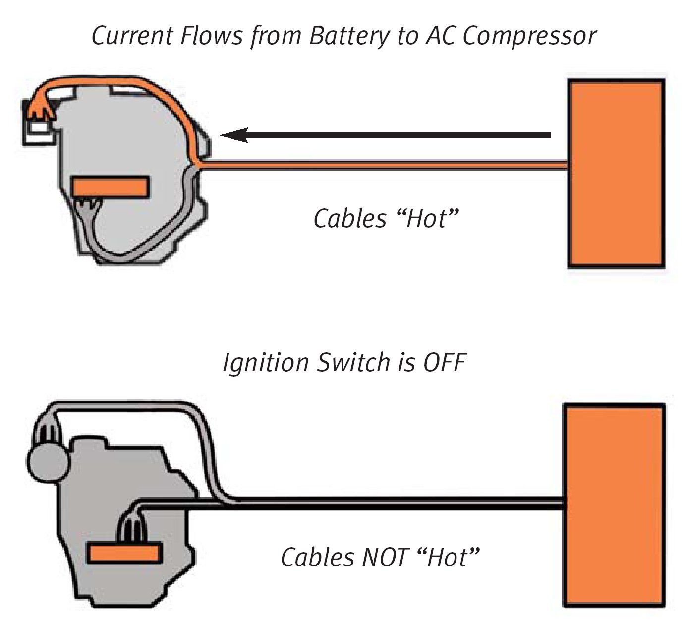 The only condition common to all three situations in which the cables can be hot is that the ignition is on. Therefore: When the ignition switch is off, electric current cannot flow into the high-voltage cables.