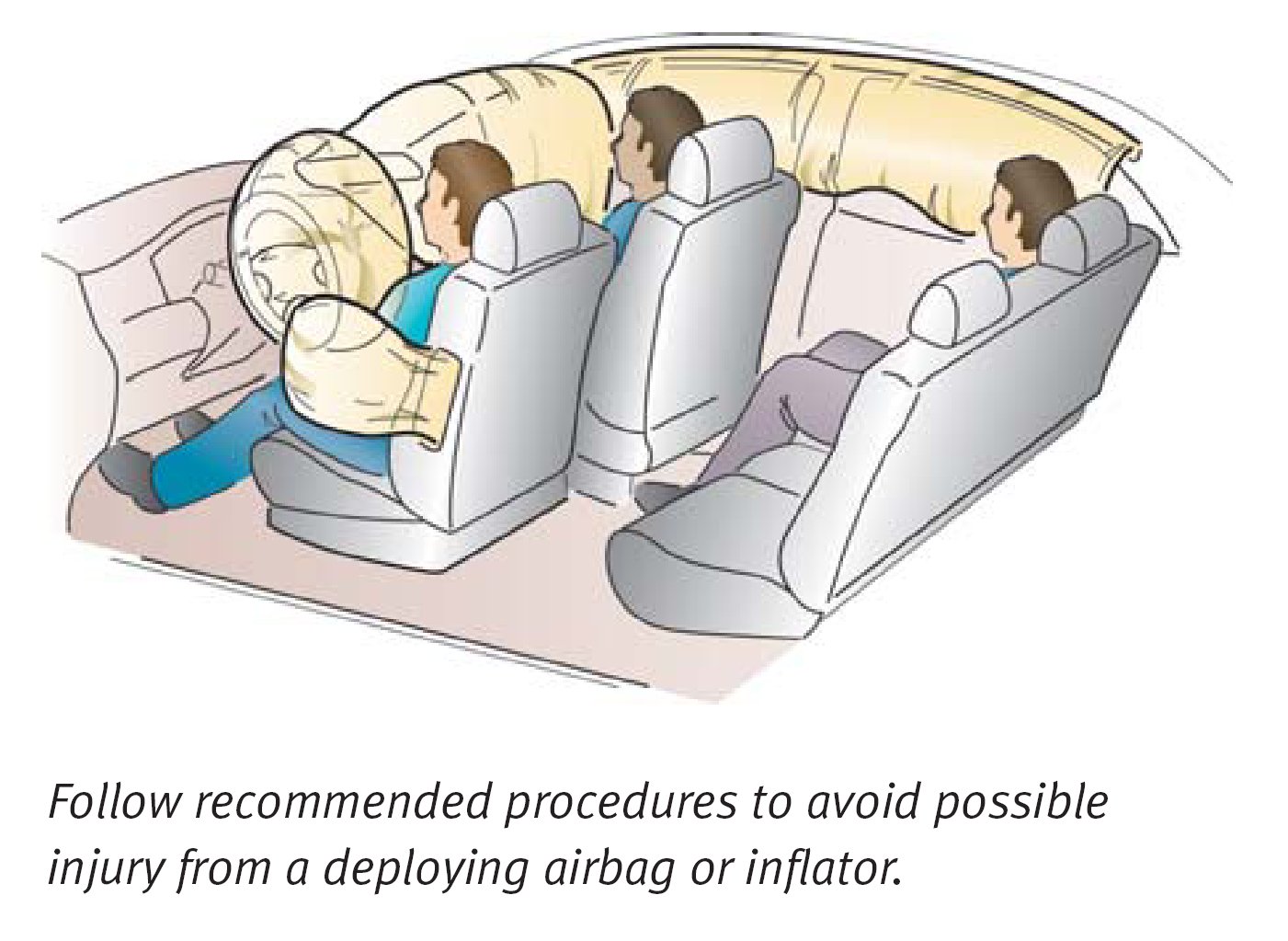 Being struck at close range by a deploying front or side airbag, or cutting into an unactivated inflator, can result in moderate to severe injuries. Injuries can also result from contact with a deploying side curtain airbag, or having a seat belt tensioner activate unexpectedly.