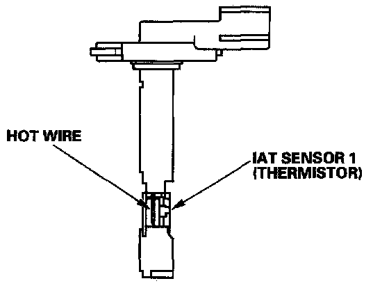 The MAF sensor/IAT sensor 1 contains a hot wire and a thermistor. It is located in the intake air passage. The resistance of the hot wire and thermistor change due to intake air temperature and air flow. The control circuit in the MAF sensor controls the current to keep the hot wire at a set temperature. The current is converted to voltage in the control circuit, then output to the PCM.