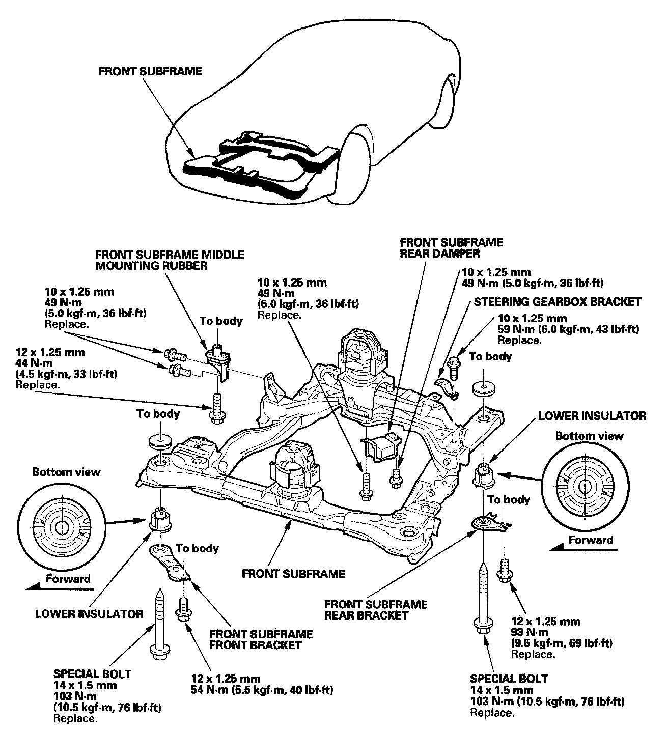 After removing the subframe mounting bolts, be sure to replace them with new ones.