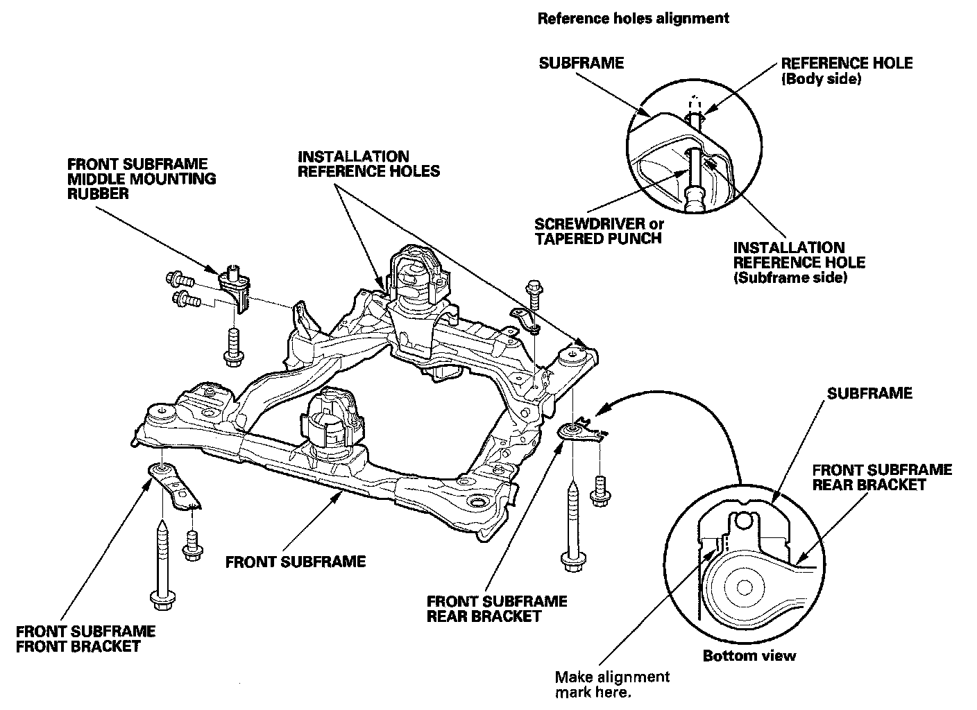- When installing, align both installation reference holes in the subframe with both reference holes in the body using a screwdriver or tapered punch as a guide.