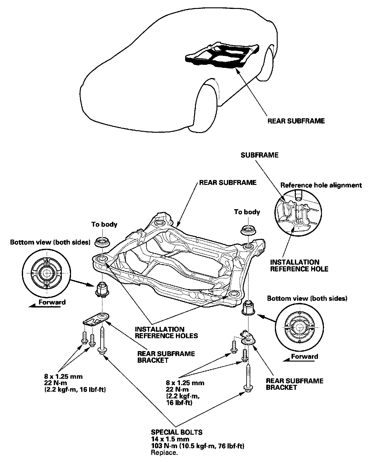 - After mounting the subframe and brackets loosely, align the reference marks with the edge of the rear brackets then tighten all bolts.