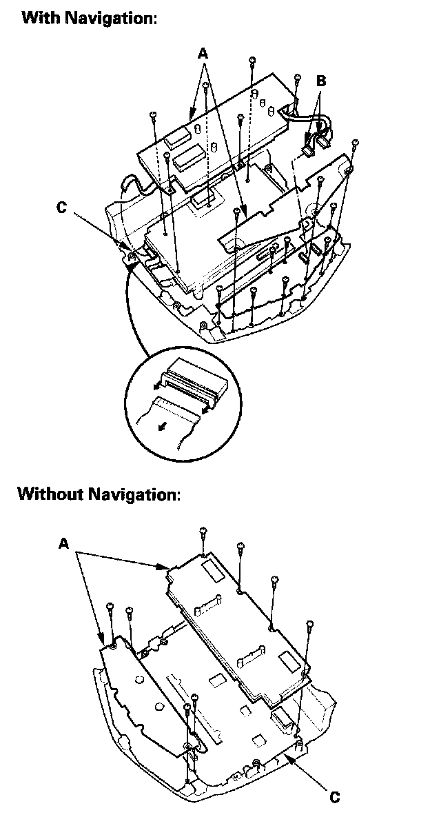 3. Remove the mounting screws and the covers (A), then disconnect the connectors (B) (Navigation system) from the printed circuit board (C).
