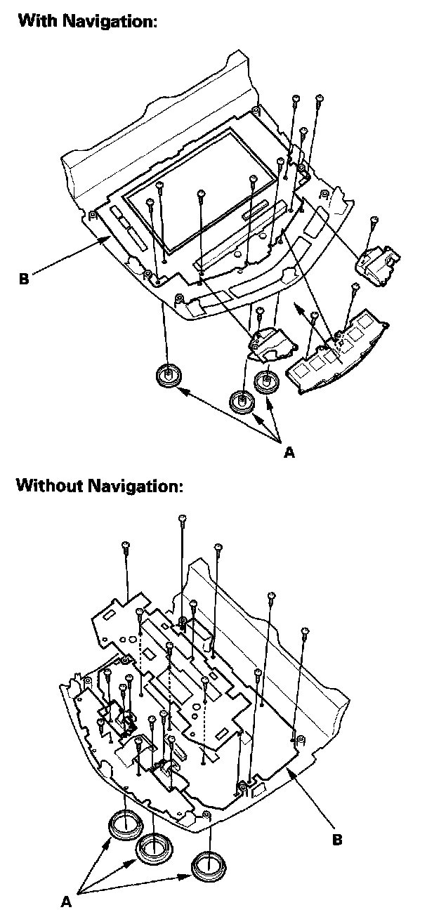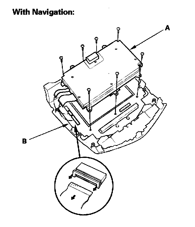 4. With navigation system: Remove the mounting screws and display unit (A) from the printed circuit board (B).