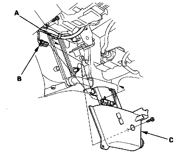 3. Remove the harness clip (A), then disconnect the 2P connector from the heater core temperature sensor (B). Remove the self-tapping screws and the heater core cover (C).