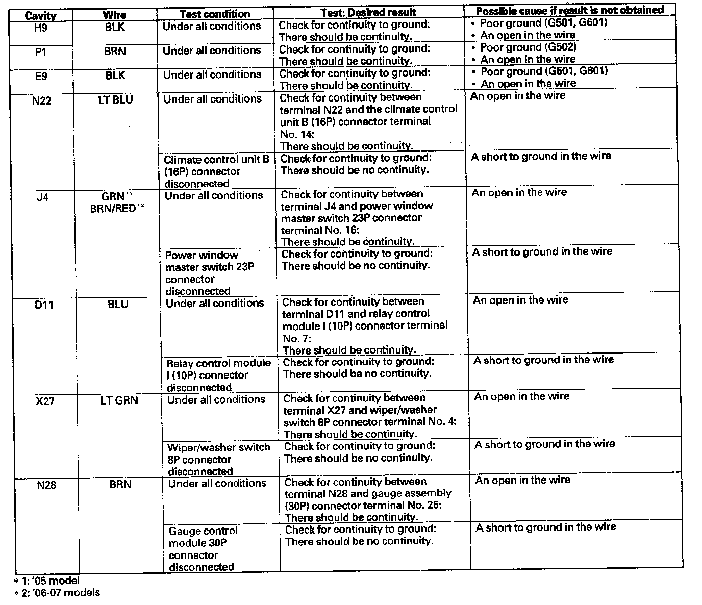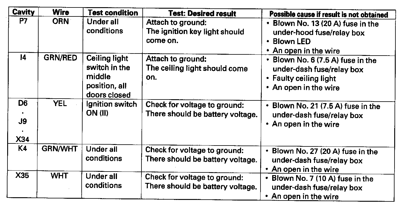 5. Reconnect the connectors to the under-dash fuse/relay box, and make sure these input tests at the appropriate connectors on the under-dash fuse/relay box.