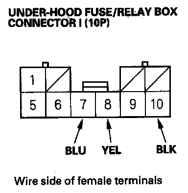 5. Disconnect the 1OP connector from the under-hood fuse/relay box, and make input tests at the connector.