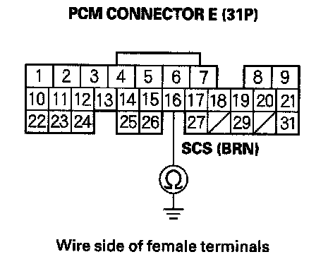 16. Check for continuity between PCM connector terminal E16 and body ground.