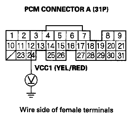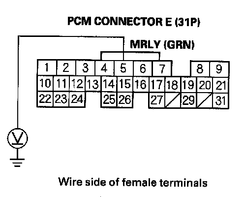 33. Measure voltage between PCM connector terminal E5 and body ground.