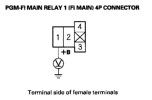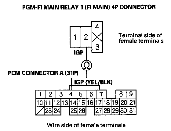 27. Check for continuity between body ground and PGM-FI main relay 1 (FI MAIN) 4P connector terminals No. 1 and No. 3 individually.