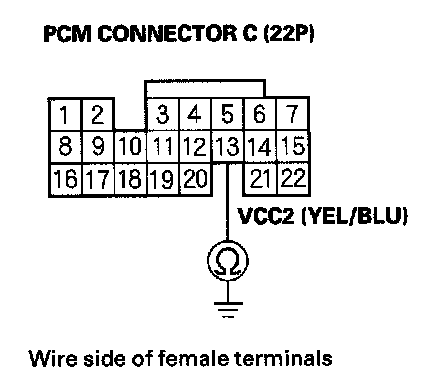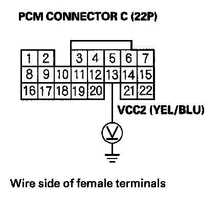 61. Disconnect the connector from each of the following sensors, one at a time, and measure voltage between body ground and PCM connector terminal C13 with the ignition switch ON (II).