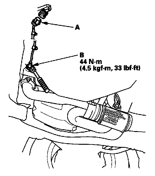 1. Disconnect the rear secondary HO2S 4P connector (A), then remove the rear secondary HO2S (B) with an 02 sensor socket wrench.