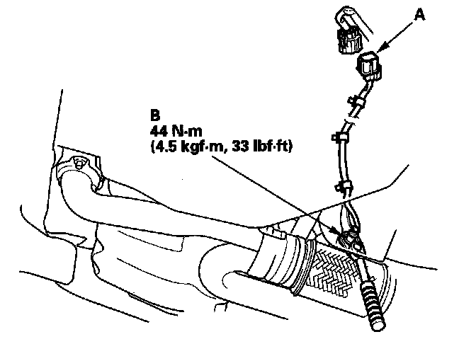 1. Disconnect the front secondary HO2S 4P connector (A), then remove the front secondary HO2S (B) with an 02 sensor socket wrench.