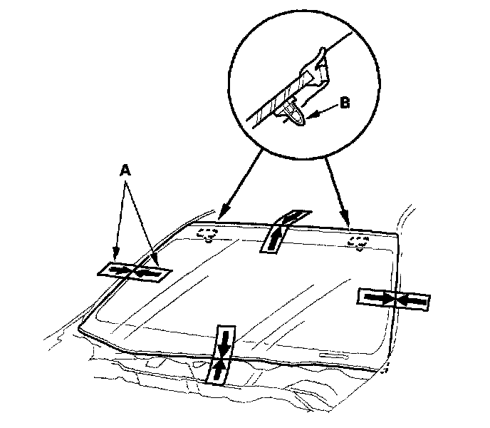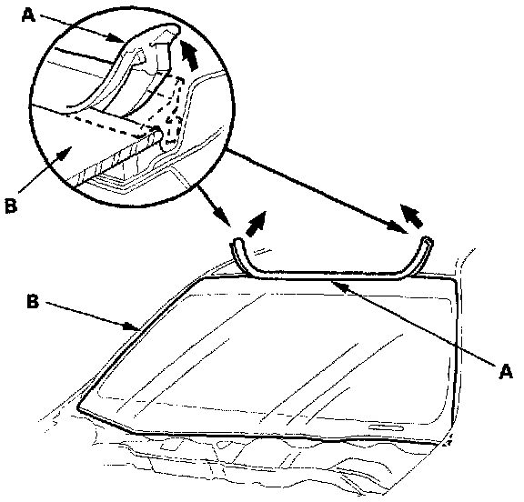 2. Remove the molding (A) from the upper edge of the windshield (B). If necessary, cut the molding with a utility knife.