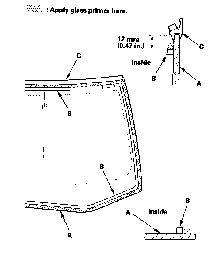 16. With a sponge, apply a light coat of glass primer around the edge of the windshield (A) between the dams (B) and molding (C) as shown, then lightly wipe it off with gauze or cheesecloth: