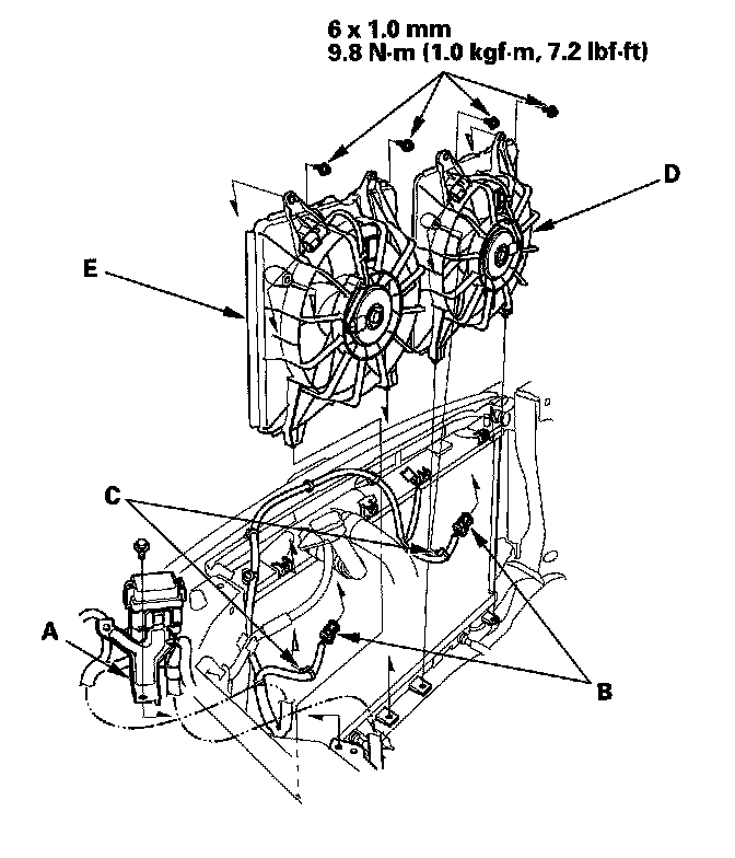 11. Remove the bolt and the auxiliary under-hood fuse/relay box bracket (A). Disconnect the connectors (B), then remove the wire harness clips (C). Remove the upper mounting bolts, the A/C condenser fan shroud (D), and the radiator fan shroud (E). Be careful not to damage the radiator fins when removing the A/C condenser fan shroud and radiator fan shroud.