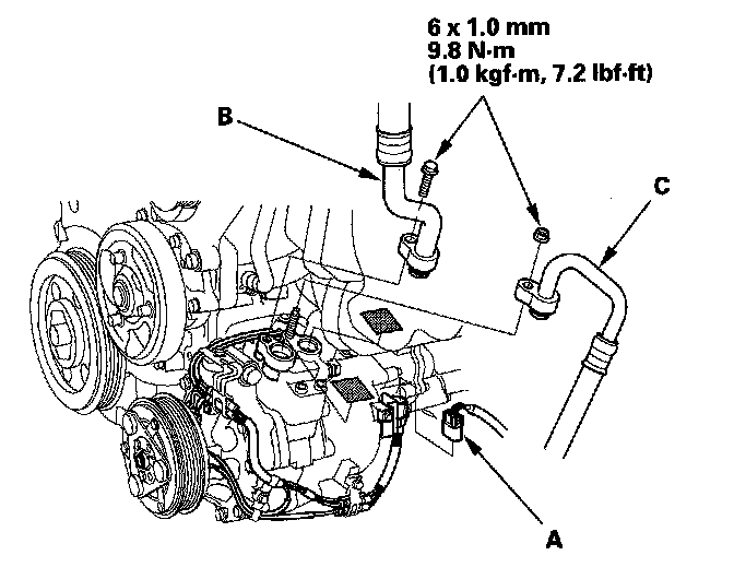 12. Disconnect the A/C compressor clutch connector (A). Remove the bolt and the nut, then disconnect the suction hose (B) and discharge hose (C) from the A/C compressor. Plug or cap the lines immediately after disconnecting them to avoid moisture and dust contamination.