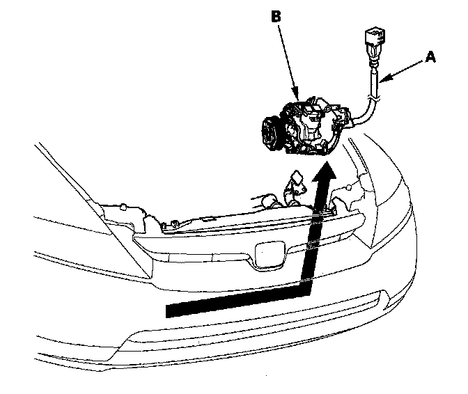 14. Pull out on the power cable (A), then lift up the A/C compressor (B).