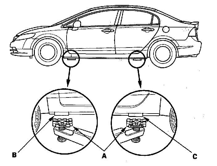 1. Position the lift blocks (A) under the vehicle's front support points (B) and rear support points (C).