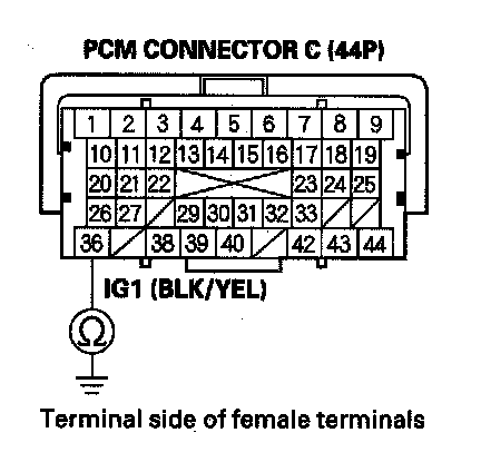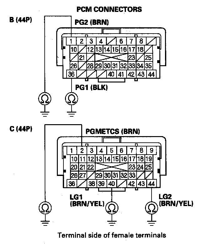 73. Check for continuity between body ground and PCM connector terminals B1, B36, C2, C40, and C44 individually.