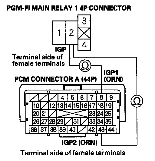 70. Check for continuity between PGM-FI main relay 1 4P connector terminal No. 2 and PCM connector terminal A8 and A43 individually.