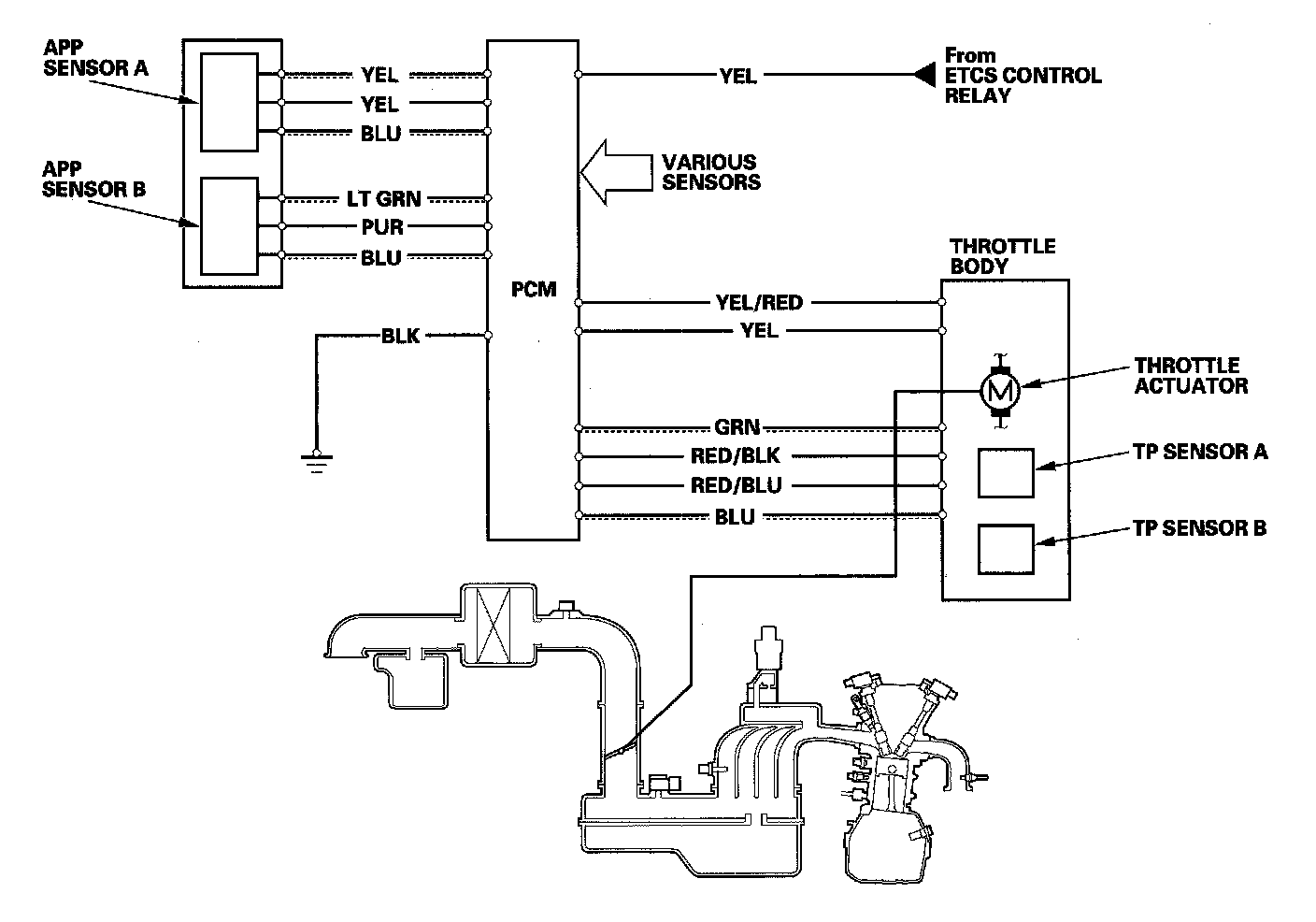 The electronic throttle control system consists of the throttle actuator, throttle position (TP) sensor A/B, accelerator pedal position (APP) sensor A/B, electronic throttle control system (ETCS) control relay, and the PCM.