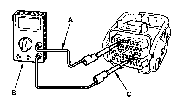 6. Connect one side of the patch cord (A) terminals to a commercially available digital multimeter (B), and connect the other side of the patch cord terminals to a commercially available banana jack (Pomona Electronics Tool No. 3563 or equivalent) (C).