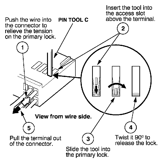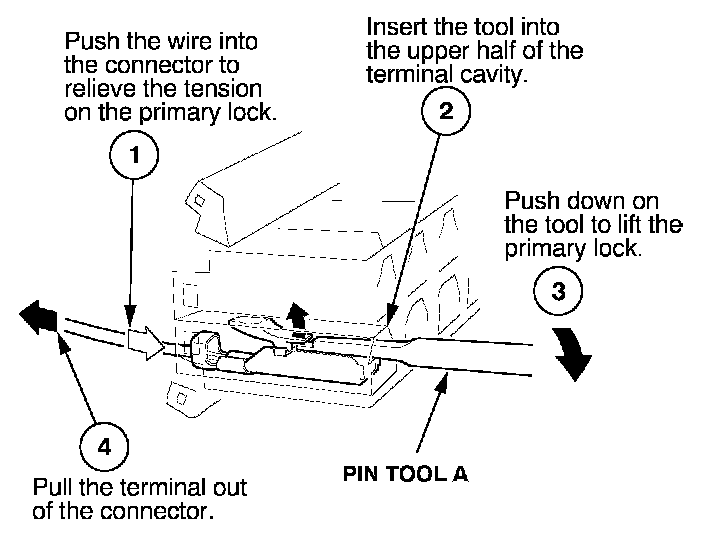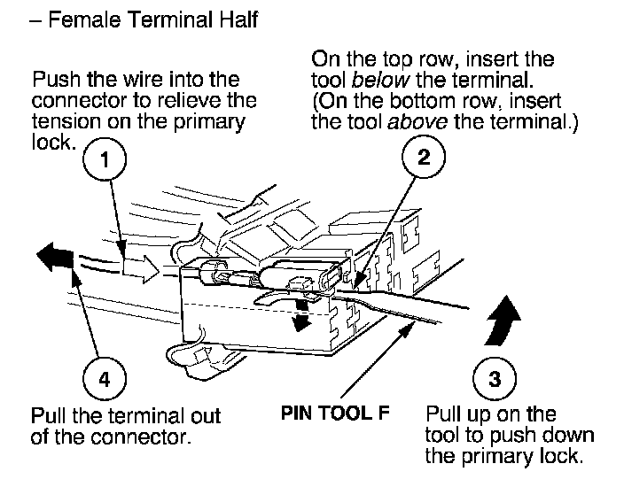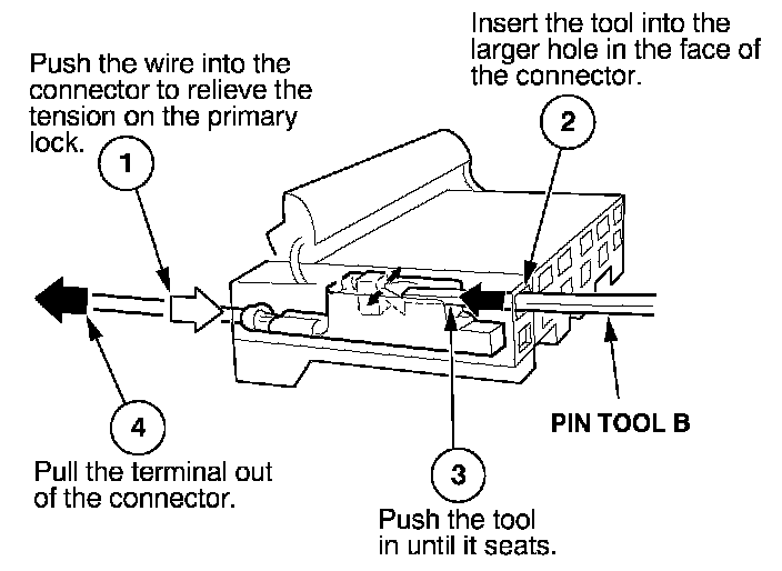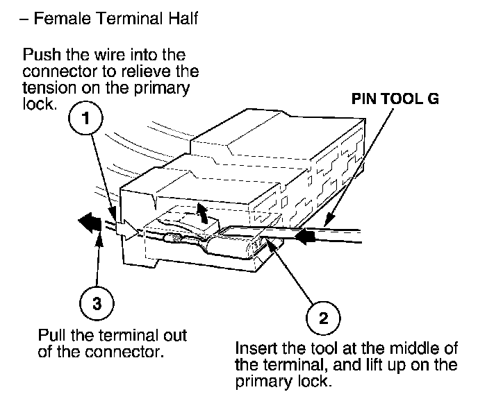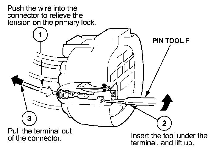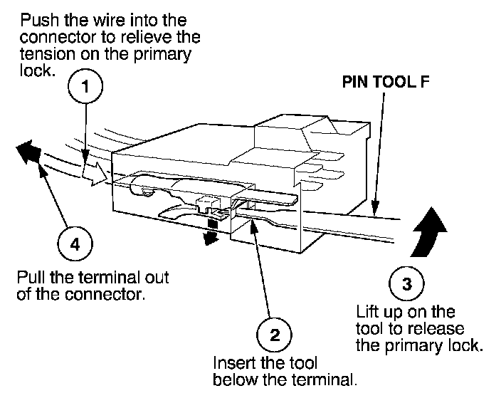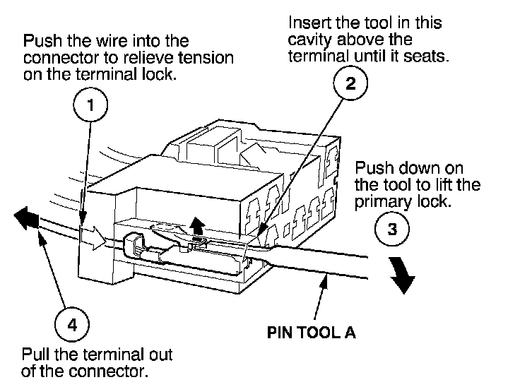 Before you begin, inspect the wire you are about to repair for damage and length. Make sure the wire will be long enough to make a terminal repair without stretching it when you reinstall the terminal in the connector. If the wire is too short, or if access to the connector is too restricted to make a terminal repair, you may need to install a pigtail terminal (a short length of wire with a factory-crimped terminal on it). Refer to HOW TO INSTALL PIGTAIL TERMINALS.