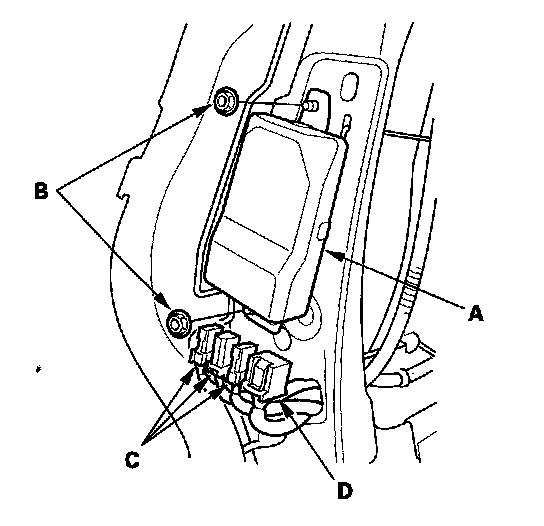 1. Place the new ODS unit (A) on the seat-back frame. Tighten the two nuts (B), and connect the ODS unit harness 18P connector (D) and sensor connectors (C) to the ODS unit.