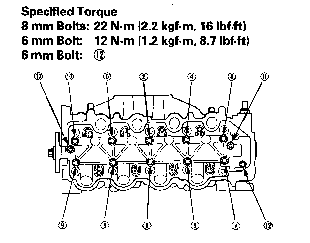 Tighten the cylinder head bolts in sequence 29 Nm (3.0 kgf-m, 22 ft. lbs.)
