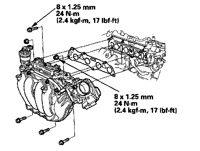 Install the intake manifold assembly (A) and tighten the bolts/nuts in a crisscross pattern in two or three steps, beginning with the inner bolt. Use a new gasket (B).