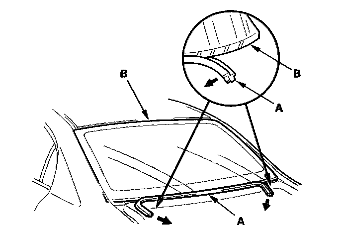 6. Remove the lower rubber dam (A) from the lower edge of the rear window (B). If necessary, cut the molding with a utility knife.