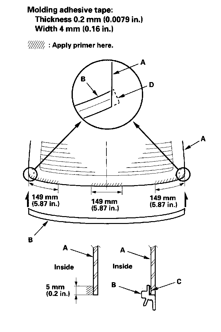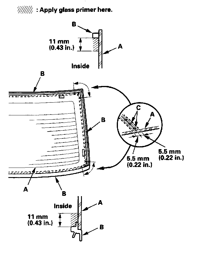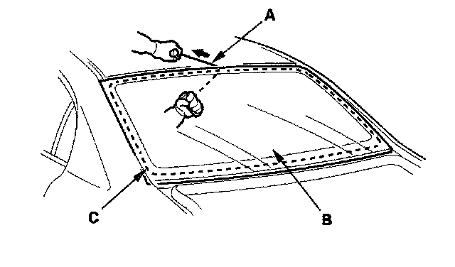 12. Apply primer to the edge of the rear window (A) where the lower rubber dam adhesive tape will be attached as shown. Attach the lower rubber dam (B) with adhesive tape (C) to the lower edge of the rear window: