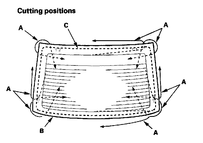 7. With a helper on the outside, pull the piano wire (A) back and forth in a sawing motion. Hold the piano wire as close to the rear window (B) as possible to prevent damage to the body, and carefully cut through the adhesive (C) around the entire rear window.