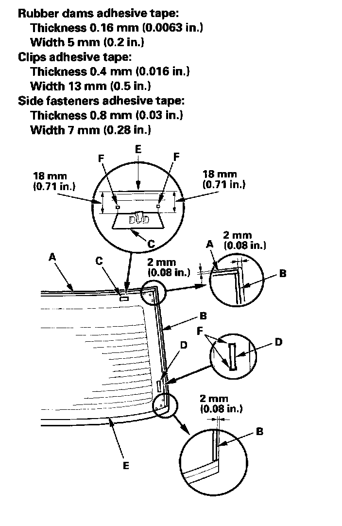 13. Attach the upper rubber dams (A), side rubber dams (B), clips (C), and side fasteners (D) with adhesive tape to the inside face of the rear window (E) as shown: